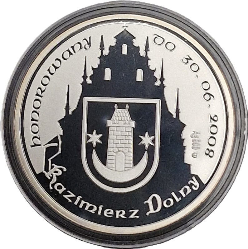 W centralnej części monety herb miasta na tle konturów budowli. U dołu monety półkolem napisy: Kazimierz Dolny. W otoku po lewej napisy: honorowany, a po prawej do 30-06-2008. Pod datą oznaczenie próby Ag500 oraz znak Mennicy Polskiej S.A.: m/w