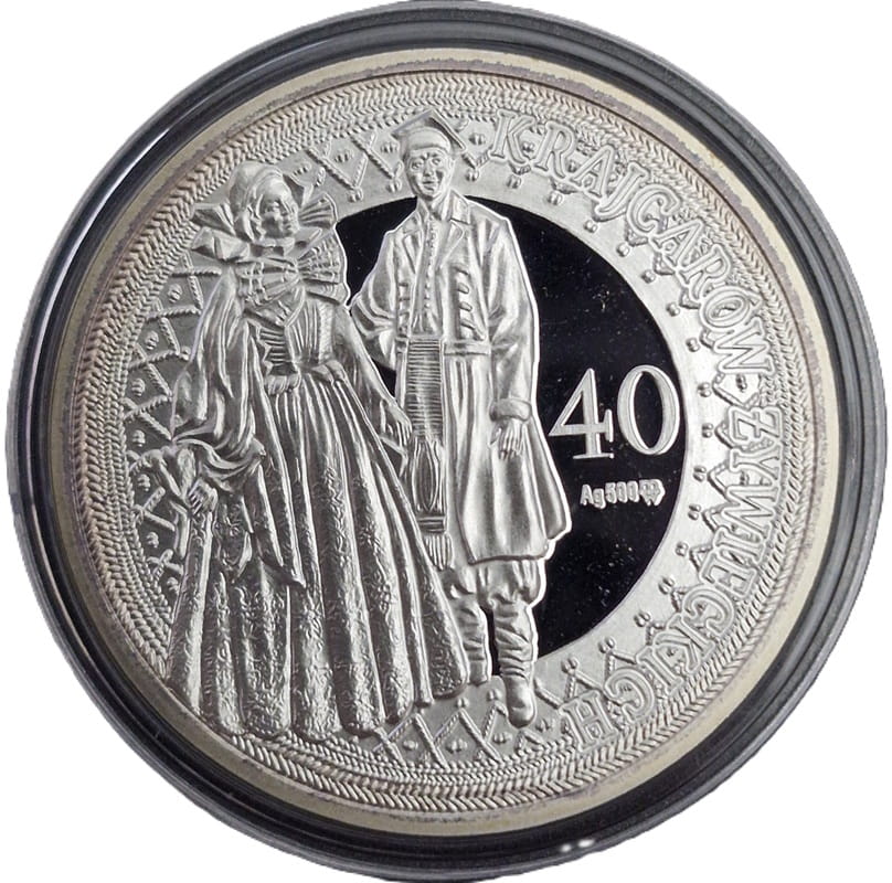 Na pierwszym planie kobieta i mężczyzna w strojach ludowych na tle ozdobnej koronki. Blisko centralnego położenia nominał 40 oraz próba Ag500 i znak mennicy: m/w. Na Koronce po prawej stronie blisko rantu monety dużymi literami napisy: Krajcarów Żywieckich