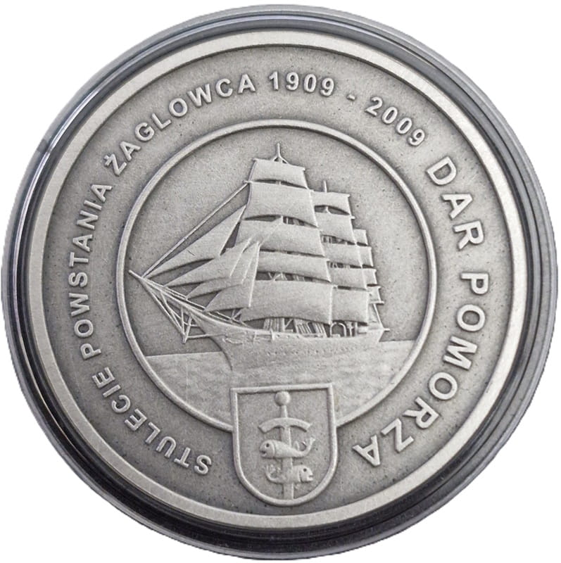 W centralnej części w okręgu żaglowiec Dar Pomorza na pełnym morzu. U dołu nachodzący na okrąg herb miasta. W otoku monety na pierścieniu dużymi literami: Stulecie powstania żaglowca 1909-2009 DAR POMORZA