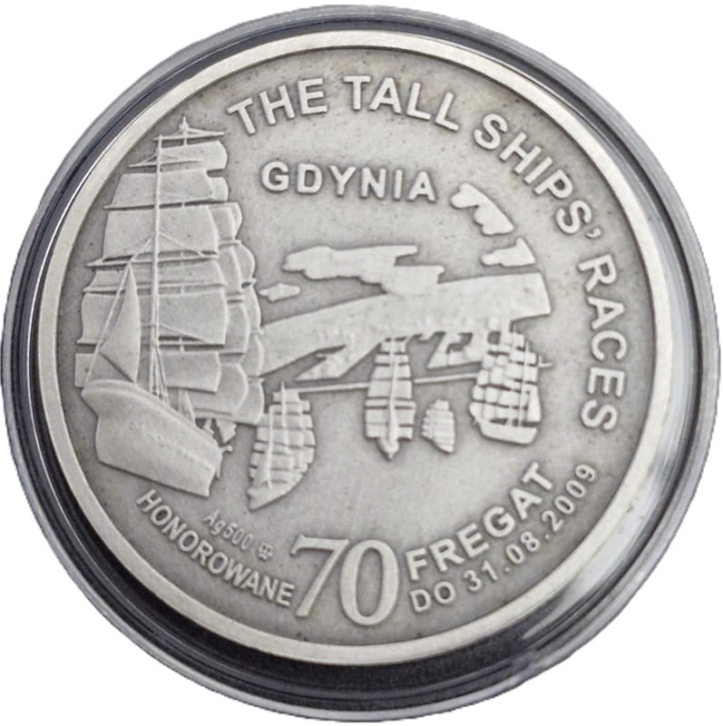 Na grafice kilka ujęć żaglowców. U góry monety dużymi literami napisy: The Tall Ships Races. U dołu monety jej nominał 70 fregat oraz napisy Honorowane do 31.08.2009, próba Ag500 i znak Menniczy Polskiej S.A. m/w