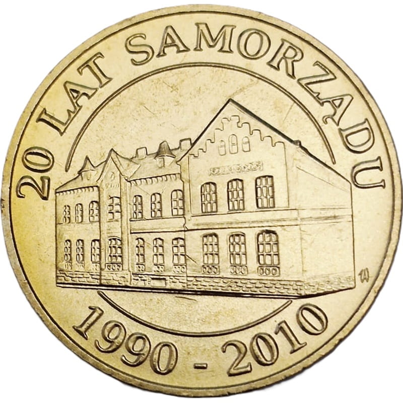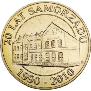 Na wyodrębnionej płaszczyźnie, pierścieniu wokół rantu monety u góry półkolem dużymi literami napisy: 20 lat Samorządu. U dołu dwie daty 1990-2010. W środkowej części monety wchodzący na pierścień budynek Urzędu Miasta Nakło nad Notecią. Po prawej stronie u dołu budynku monogram projektanta