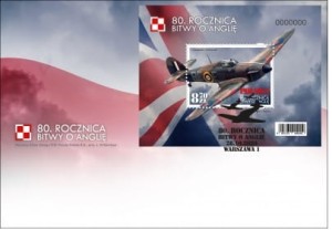 Samolot bojowy podczas lotu. W lewym dolnym rogu nominał znaczka 8,70 zł, w prawym dolnym rogu napis dużymi literami: Polska, a poniżej w dwóch rzędach napis: 90. Rocznica bitwy o Anglię. Na bloczku z lewej strony stylizowany fragment flagi Królestwa Brytyjskiego, po prawej stronie błękit nieba z chmurami.
