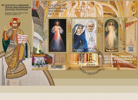 Koperta FDC 90. rocznica objawień Jezusa siostrze Faustynie 2021 r. - Koperta FDC ze znaczkiem kolekcjonerskim oraz stemplem okolicznościowym.
