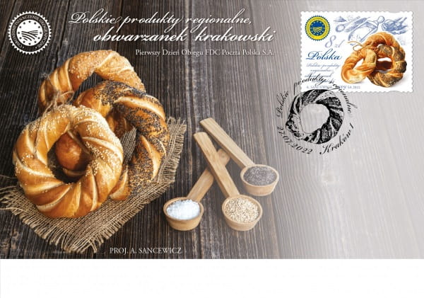Koperta FDC Polskie produktu regionalne Obwarzanek Krakowski 2022 r. - Koperta FDC ze znaczkiem kolekcjonerskim oraz stemplem okolicznościowym.