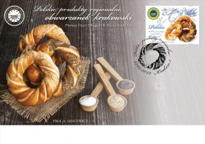 Na grafice koperty FDC widnieją trzy rodzaje obwarzanków krakowskich położone na serwetce. Obok łyżki z przyprawami / dodatkami: sól, mak oraz sezam. U dołu podany projektant grafiki A. Sancewicz. U góry stylizowane napisy: Polskie produkty regionalne. Obwarzanek krakowski