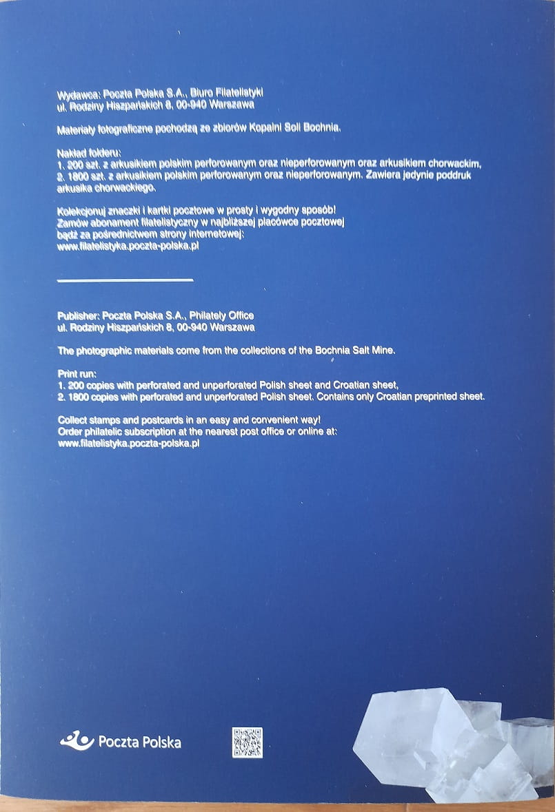 Skarby ziemi Arkusz 8 znaczków wykonany offsetową techniką druku. Arkusz zawiera 8 znaczków po 4 z każdego z dwóch rodzajów. Na jednym znaczku została przedstawiona Kopalnia Soli w Bochni oraz kryształki soli kamiennej, a na drugim Solana Ston w Chorwacji i sól pozyskiwaną z morza. Emisja tej pozycji została wypuszczona wspólnie z Pocztą Chorwacji.