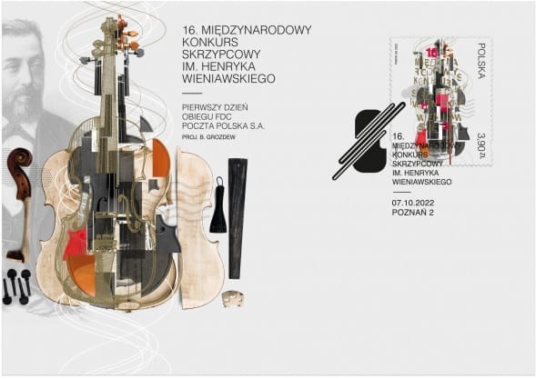 16. Międzynarodowy Konkurs Skrzypcowy im. Henryka Wieniawskiego 2022 r. - koperta FDC z pierwszego dnia obiegu ze stemplem okolicznościowym o ograniczonym nakładzie kolekcjonerskim.