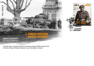 Na grafice zdjęcie ze zbiorów Instytutu Polskiego i Muzeum im. gen. Sikorskiego w Londynie zwycięski czołg 1. Dywizji Pancernej na skrzyżowaniu dróg pod Breda w Holandii w roku 1944. Przy lewej krawędzi koperty pionowo w górę napisy: PROJ. A. TOBOLCZYK. Na dole białą czcionką w dwóch rzędach na zdjęciu napisy: Pierwszy Dzień Obiegu / FDC Poczta Polska S.A. Na dole w środkowej części w dwóch rzędach pomarańczową czcionką napisy: 1. Dywizja Pancerna / - Odyseja Wolności