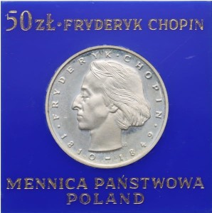 Moneta 50 zł Chopin 1972 r. - Srebrna moneta kolekcjonerska PRL (Polska Rzeczpospolita Ludowa) w niebieskim kwadratowym pudełku