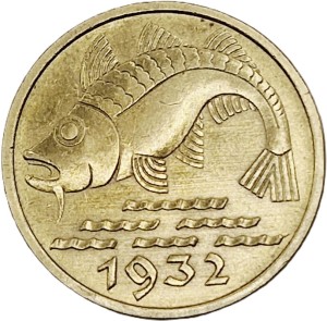 Na awersie u góry stylizowany wizerunek ryby dorsza, poniżej stylizowane linie fal w trzech rzędach, gdzie pierwszy rząd to jedna fala, drugi rząd to dwie fale oraz trzeci rząd trzy fale. U dołu monety między najniższą falą a rantem monety, rok jej emisji 1932