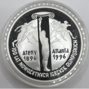 10 zł 100 lat Nowożytnych Igrzysk Olimpijskich Ateny - Atlanta 1995 r. - Srebrna moneta kolekcjonerska NBP (Narodowy Bank Polski) z serii Igrzyska Olimpijskie. Moneta w kapslu ochronnym.