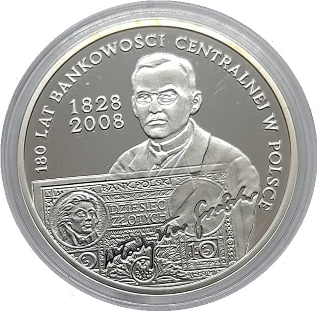 Na rewersie umieszczono wizerunek Władysława Grabskiego. Z lewej strony widnieje napis: 1828–2008. U dołu, przed postacią, przedstawiono stylizowany wizerunek banknotu 10-złotowego z 1919 roku. Ukośnie umieszczono faksymile podpisu Władysława Grabskiego. U góry, półkolem, znajduje się napis: 180 LAT BANKOWOŚCI CENTRALNEJ W POLSCE.