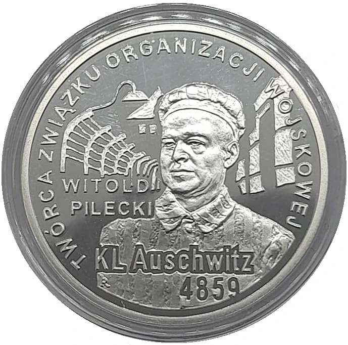 Na rewersie przedstawiono stylizowany wizerunek Witolda Pileckiego na tle obozu Auschwitz-Birkenau. Wzdłuż rantu umieszczono napis: TWÓRCA ZWIĄZKU ORGANIZACJI WOJSKOWEJ.