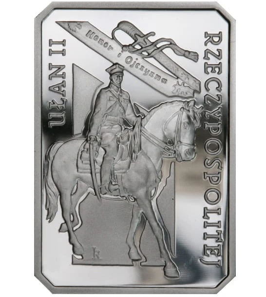 10 zł Ułan II Rzeczpospolitej - Srebrna moneta kolekcjonerska NBP z serii Historia Jazdy Polskiej. Moneta w kwadratowym kapslu ochronnym.