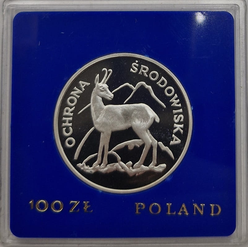 Moneta 100 zł Kozica 1979 rok - Srebrna moneta kolekcjonerska PRL w niebieskim pudełku z serii Ochrona Środowiska.