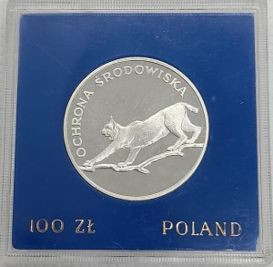 100 zł Ryś 1979 r. - srebrna moneta kolekcjonerska PRL, producent Mennica Polska S.A., seria Ochrona środowiska, stempel lustrzany, moneta w niebieskim pudełku.