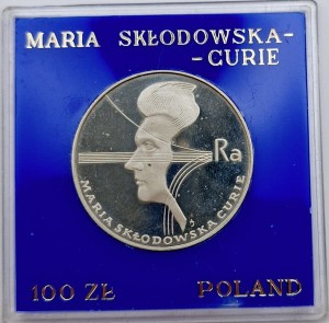 100 zł Maria Skłodowska-Curie 1974 r. - Srebrna moneta kolekcjonerska PRL (Polska Rzeczpospolita Ludowa). Moneta w niebieskim pudełku.