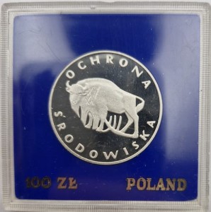 100 zł Żubr 1977 r. - Moneta kolekcjonerska PRL z kategorii srebrne monety kolekcjonerskie PRL, producent Mennica Polska S.A., seria Ochrona środowiska, stempel lustrzany, moneta w niebieskim pudełku.