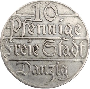 Moneta obiegowa Wolnego Miasta Gdańsk wprowadzona do obiegu 12 lipca 1932 roku, nominał 10 fenigów średnica 21,50 mm, masa 4,00 g, rok emisji 1923, wielkość emisji 5 000 000 sztuk, stempel zwykły, metal miedzionikiel stan zachowania około 3