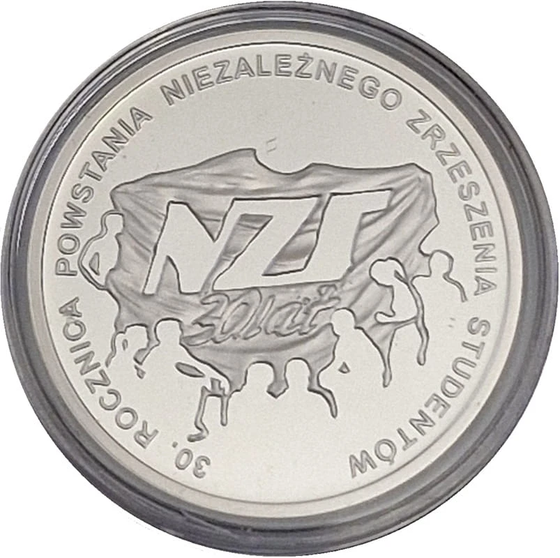 30. rocznica powstania Niezależnego Zrzeszenia Studentów 2011 r. - srebrna moneta kolekcjonerska 10 złotych NBP, temat indywidualny, stempel lustrzany, moneta w kapslu ochronnym, stan zachowana menniczy, real foto