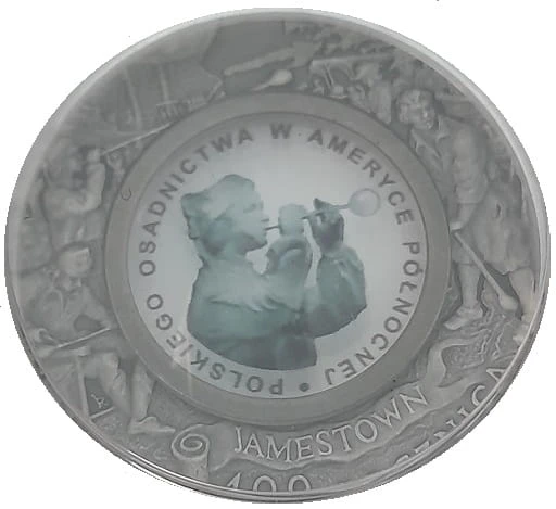 Moneta upamiętnia udział Polaków w pierwszych koloniach angielskich w Ameryce Północnej, w tym w Jamestown na początku XVII wieku. Polscy rzemieślnicy, w tym hutnicy szkła, odegrali istotną rolę w rozwoju osady, co zostało symbolicznie przedstawione na monecie poprzez motyw wydmuchiwania szkła.