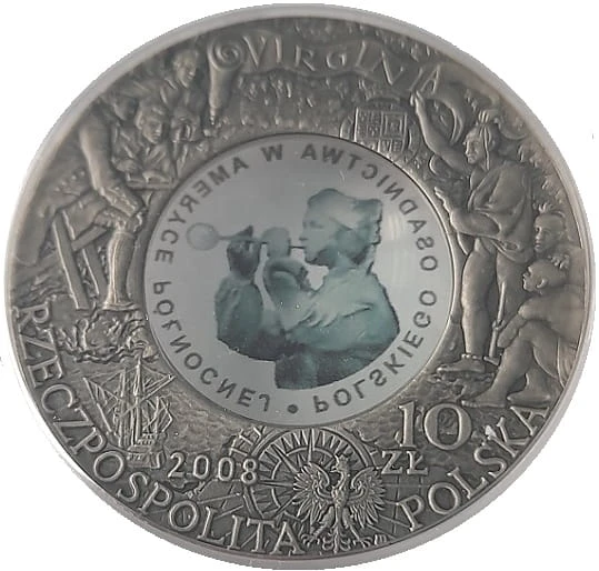 10 zł 400. rocznica polskiego osadnictwa w Ameryce Północnej 2008 r. - Moneta kolekcjonerska NBP (Narodowy Bank Polski). Moneta oksydowana z osadzoną wstawką szklaną w kapslu ochornnym.