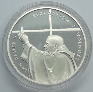 10 zł Jan Paweł II Eucharystia 1997 r. -Srebrna moneta kolekcjonerska NBP - Narodowy Bank Polski z serii Jan Paweł II. Moneta w kapslu ochronnym.