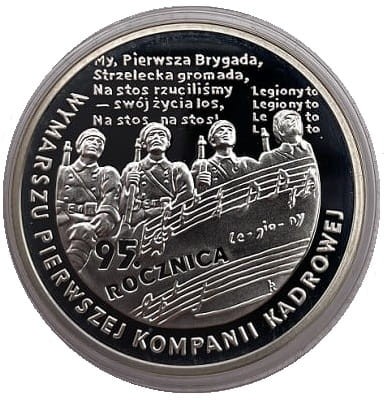 10 zł 95 Rocznica Wymarszu Kompanii Kadrowej 2009 r. - Srebrna moneta kolekcjonerska NBP. Moneta w kapslu ochronnym.