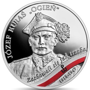 Na rewersie w jej centrum widnieje stylizowany wizerunek Józefa Kurasia ps. „Ogień”. Od połowy lewej strony przy racie monety ku górze napisy dużymi literami: Józef Kuraś "Ogień". U dołu monety zaś widnieje stylizowana bało-czerwona flaga w kształcie szarfy, a na niej symbolem Polski Walczącej oraz daty życia Józefa Kurasia 1915– 1947