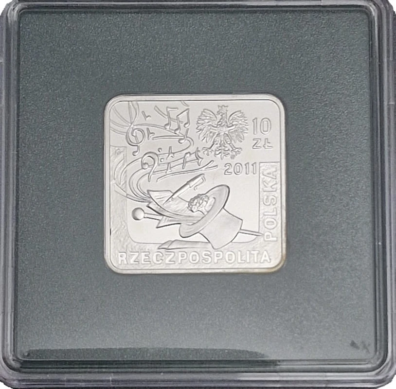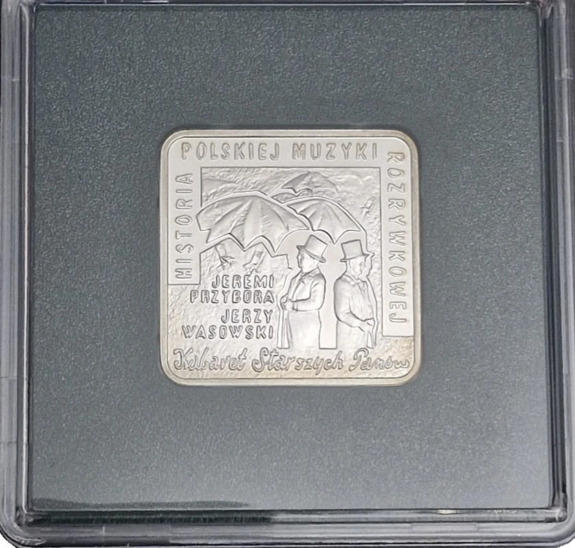 10 zł Jeremi Przybora, Jerzy Wasowski kwadrat 2011 r- - Srebrna moneta kolekcjonerska NBP z serii Historia Polskiej Muzyki Rozrywkowej numer 6 w serii. Moneta w pudełku z certyfikatem oraz folderem.