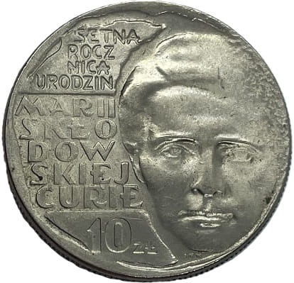 Moneta wydane z okazji 100 rocznicy urodzin Marii Skłodowskiej-Curie. Jedna z trzech monet okolicznościowych PRL z roku 1967 metal / stop miedzionikiel, producent Mennica Polska S.A., temat indywidualny, nominał 10 złotych, stempel zwykły, średnica 28 mm, masa 9,50 gram, rok emisji 1967, nakład emisji 2 000 000 sztuk, projektant monety Józef Markiewicz-Nieszcz, moneta wysyłana w bezpiecznym woreczku strunowym, stan zachowania -1