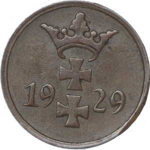 Moneta obiegowa miasta / państwa Wolnego Miasta Gdańsk z kategorii monety Wolne Miasto Gdańsk nominał 1 fenig, rok emisji 1929 roku, stempel zwykły, metal brąz, średnica 17 mm, masa 1,67 gram, najniższy nakład tego nominału 1 000 000 sztuk, projektant monety F. Fischer, stan zachowania -2, real foto