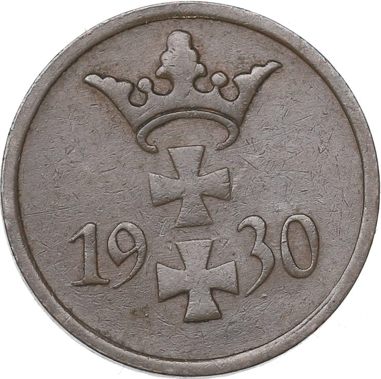 Trzeci pod względem rzadkości nominał, mobiegowa miasta / państwa Wolnego Miasta Gdańsk z kategorii monety Wolne Miasto Gdańsk nominał 1 fenig, której emisja była w 1930 roku. Bita stempelem zwykłym w metalu brąz o średnicy 17 mm oraz masie 1,67 gram. Wielkość nakładu 2 000 000 sztuk, projektant monety F. Fischer, stan zachowania -2, real foto