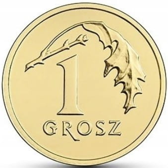 Na rewersie w jej centrum nominał 1 grosz. Poniżej nominału napis dużymi literami: GROSZ. Nad nominałem monety stylizowany liść dęb na gałązce