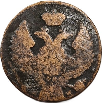 Na niemal całej powierzchni awersu orzeł carsko-królewski. U dołu monety po lewej stronie litera M, a po prawej litera przy łapach orła. Nad głowami orłów korona z krzyżem