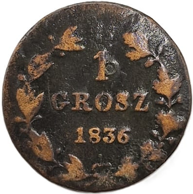 U góry nominał 1, poniżej dużymi literami napis: grosz. U dołu monety rok jej emisji 1836. Wokół monety ozdobny wieniec z kokardką u dołu. Po lewej stronie liście laurowe, po prawej stronie liście dębu z owocami