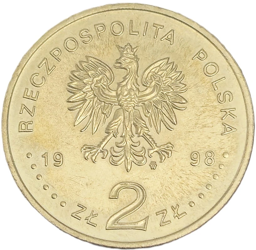 Na awersie widnieje wizerunek orła w koronie ustalony dla godła Rzeczypospolitej Polskiej, po bokach orła rok emisji: 19-98, pod orłem napis: ZŁ 2 ZŁ. W otoku napis dużymi literami: Rzeczpospolita Polska poprzedzony oraz zakończony sześcioma perełkami. Pod lewą łapą orła znak mennicy: m/w