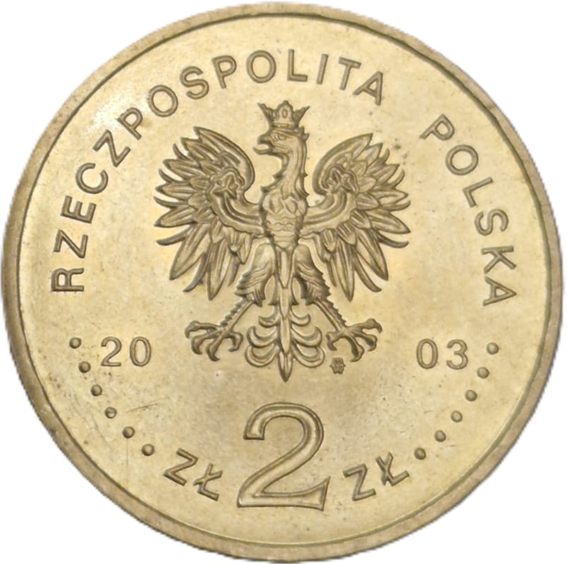 Na awersie wizerunek orła w koronie ustalony dla godła Rzeczypospolitej Polskiej. Pod orłem oznaczenie roku emisji: 2003, poniżej przy rancie monety jej nominał w zapisie: ZŁ 2 ZŁ. Po bokach łap orła wizerunki flagi państwowej. U góry półkolem napis dużymi literami: Rzeczpospolita Polska. Pod lewą łapą orła znak mennicy: m/w