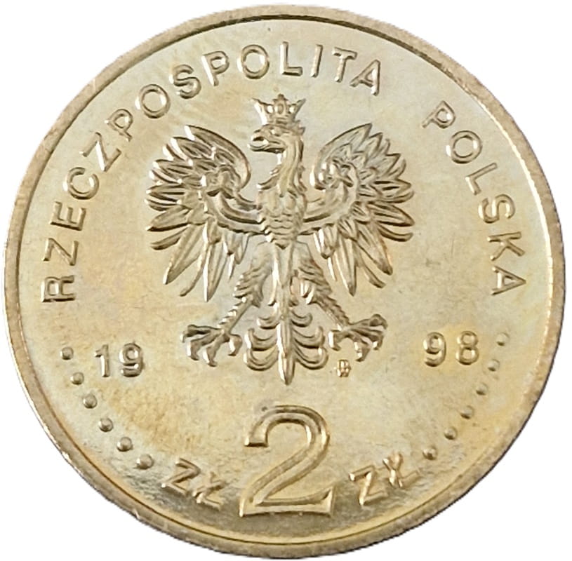 Na awersie orzeł w koronie ustalony dla godła Rzeczypospolitej Polskiej. Pod orłem roku emisji monety: 1998. Wokół rontu półkolem napis dużymi literami: Rzeczpospolita Polska. Na dole monety napis: ZŁ 2 ZŁ oddzielony od poprzedniego na początku i na jego końcu sześcioma koralikami. Pod lewą łapą orła znak mennicy: m/w