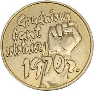 Na rewersie z prawej strony fragment przedramienia z zaciśniętą pięścią. Z lewej strony napis: Grudniowy / bunt / robotniczy / 1970 r.