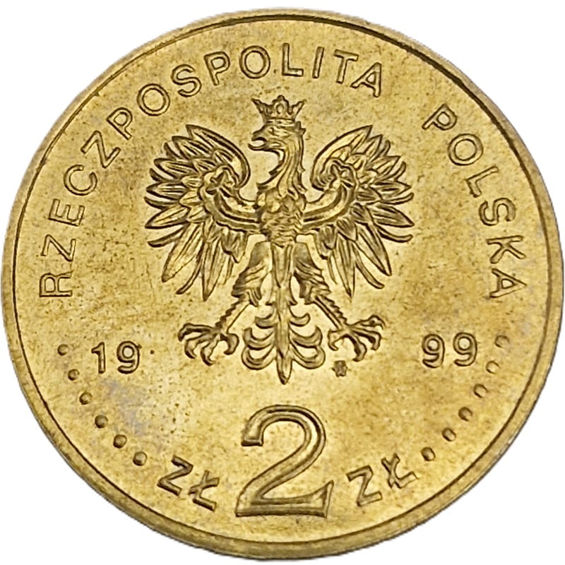 Na awersie orzeł w koronie ustanowiony dla godła Rzeczypospolitej Polskiej, po bokach orła rok emisji monety:19-99, pod orłem nominał monety w zapisie ZŁ 2 ZŁ. W otoku napis dużymi literami: Rzeczpospolita Polsk poprzedzony oraz zakończony sześcioma perełkami. Pod lewą łapą orła znak mennicy: m/w