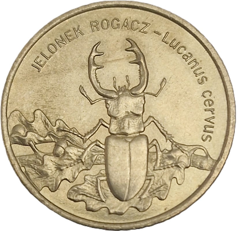 Na rewersie został umieszczony stylizowany chrząszcz Jelonek Rogacz na gałązce dębu na której widać liście oraz żołędzie. W górnej części monety przy jej rancie napis: JELONEK ROGACZ - Lucanus cervus