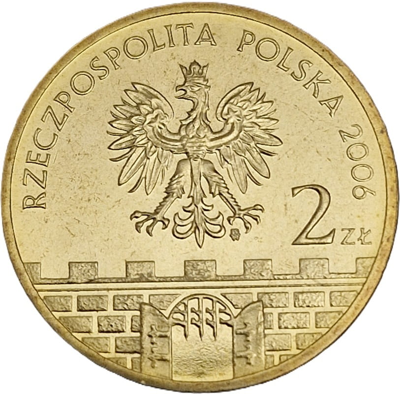 Na awersie w jej centralnym położeniu orzeł w koronie ustalony dla godła Rzeczypospolitej Polskiej. Poniżej orła stylizowany fragment murów miejskich z blankami i bramą z uniesioną kratą. Z prawej strony monety przy rancie jej nominał 2 ZŁ. U góry monety półkolem napis dużymi literami: Rzeczpospolita Polska oraz rok emisji 2006. Pod lewą łapą orła znak mennicy m/w.