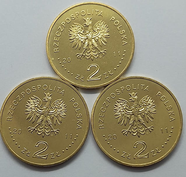 Na awersie orzeł w koronie ustalony dla godła Rzeczypospolitej Polskiej. Pod orłem rok emisji monety: 2011, poniżej jej nominał w zapisie: ZŁ 2 ZŁ. U góry półkolem napis: RZECZPOSPOLITA POLSKA. Pod lewą łapą orła znak mennicy m/w.