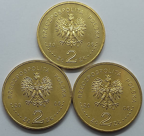 Na awersie wizerunek orła w koronie ustalony dla godła Rzeczypospolitej Polskiej. Po bokach orła rok emisji monety: 20-06. Pod orłem nominał monety w zapisie: ZŁ 2 ZŁ, w otoku przy rancie monety napis: RZECZPOSPOLITA POLSKA poprzedzony oraz zakończony sześcioma perełkami. Pod lewą łapą orła znak mennicy: m/w