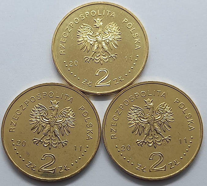 Na awersie wizerunek orła w koronie ustalony dla godła Rzeczypospolitej Polskiej. Po bokach orła rok emisji monety: 20-11. Pod orłem nominał monety w zapisie: ZŁ 2 ZŁ, w otoku przy rancie monety napis dużymi literami: Rzeczpospolita Polska poprzedzony oraz zakończony sześcioma perełkami. Pod lewą łapą orła znak mennicy: m/w