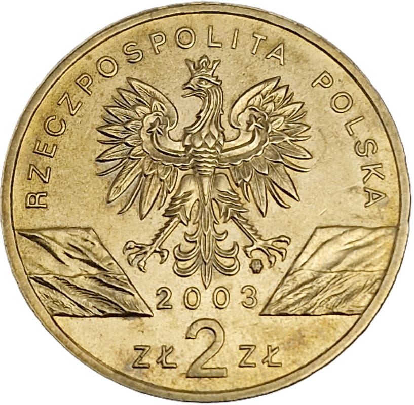 Moneta okolicznościowa Nordic Gold NG z kategorii monety 2 zł, producent Mennica Polska S.A., z serii Zwierzęta Świata, 10 z serii 20 monet, nominał 2 złote, stempel zwykły, średnica 27 mm, masa 8,15 gram, rok emisji 2003, nakład emisji 450 000 sztuk, projektant rewersu monety Ewa Tyc-Karpińska, w wysokiej jakości woreczku strunowym, stan zachowania -1, real foto