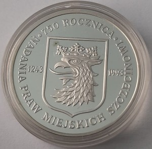 Moneta 200 000 zł 750. Rocznica Nadania Praw Miejskich Szczecinowi 1993 r. - Srebrna moneta kolekcjonerska NBP - Narodowy Bank Polski. Moneta numer w kapslu ochronnym.