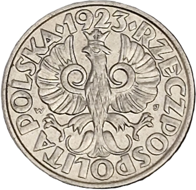 Na awersie w centrum widnieje orzeł w koronie ustanowiony dla godła Rzeczypospolitej Polskiej. W otoku monety przy jej rancie napis dużymi literami Rzeczpospolita Polska oraz rok emisji monety 1923 u góry przy rancie. Nad łapami orła inicjały projektanta, po lewej stronie W po prawej stronie J. Między szponami te monety nie posiadają znaku mennicy
