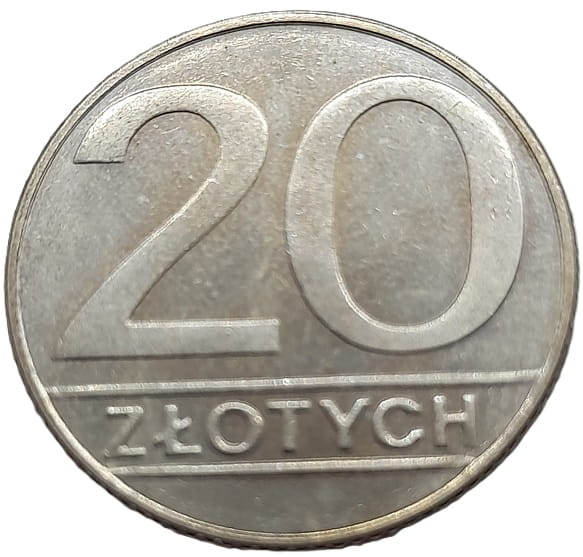 Na rewersie jej nominał duża cyfra 20 zaczynająca się od góry przy rancie monety, pod nią na dole z linią na górze i na dole napis dużymi literami: Złotych
